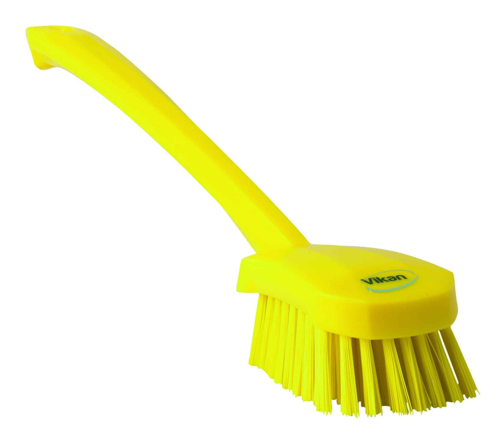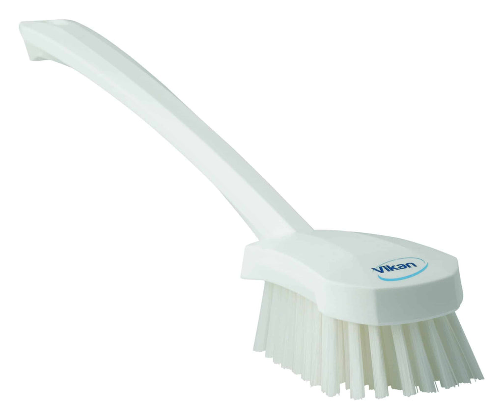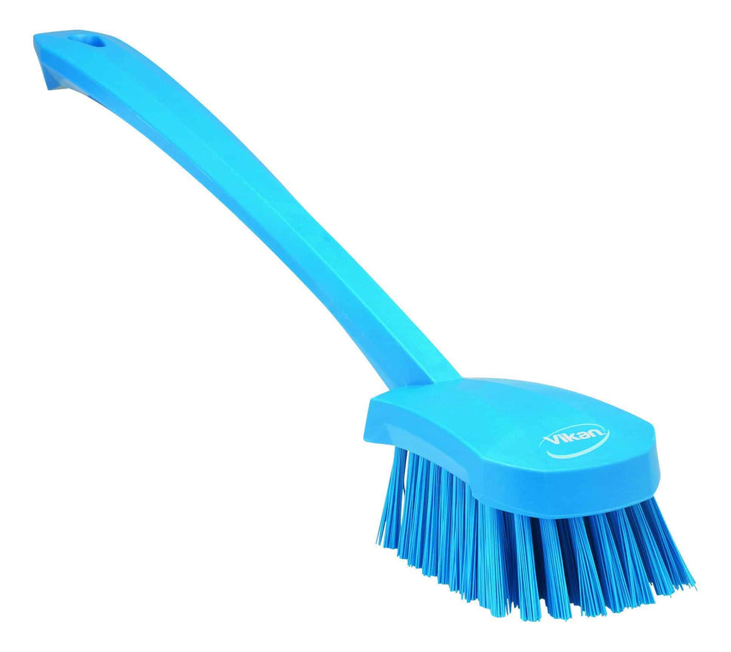 Det lange håndtag på denne børste giver mulighed for at nå dele af udstyr, der er svært tilgængelige. De vinklede stive børster fungerer godt når man skal skrubbe på afstand, f.eks. på rengøringsmaskiner, i dybe spande, containere og baljer eller andre steder med lang rækkevidde.r samt udstyr i fødevareindustrien, hvor der er behov for et langt skaft for at kunne nå overfladen som skal gøres rent. Velegnet til farvekodning og minimerer krydskontaminering.