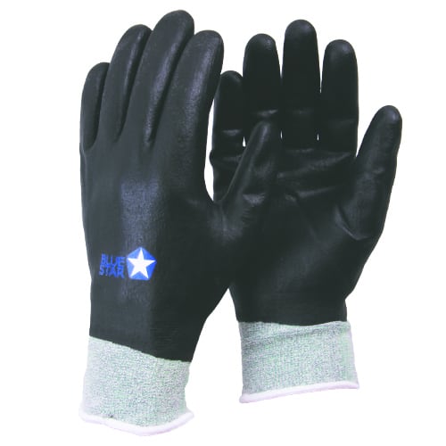 Sømløs maskinstrikket liner (gauge 15) i bambus/nylon/spandex med heldyp-belægning af opskummet nitril og integreret elastisk manchet.