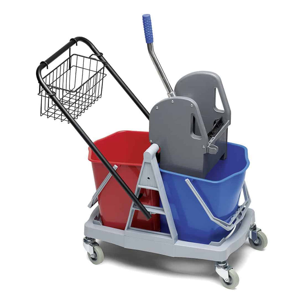 Dobbelt rengøringsvogn uden tilbehør i slagfast plast med vertikalpresse, juster bart kørehåndtag samt praktisk kurv til rengørings remedier.