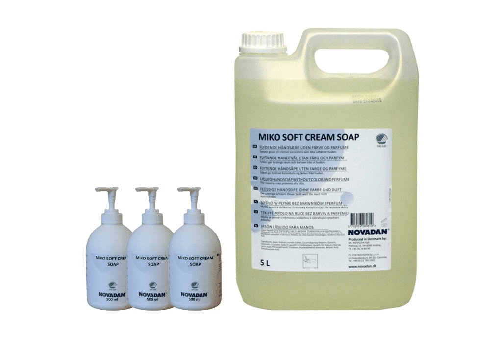 Svanemærket mild og cremet sæbe uden parfume og farvestoffer. 3x 500 ml. med pumpe + 1x5 liter.