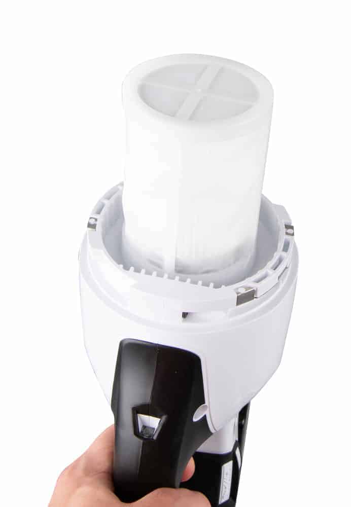 Håndholdt 18V kulfri poseløs støvsuger med høj sugeevne og teleskoprør.