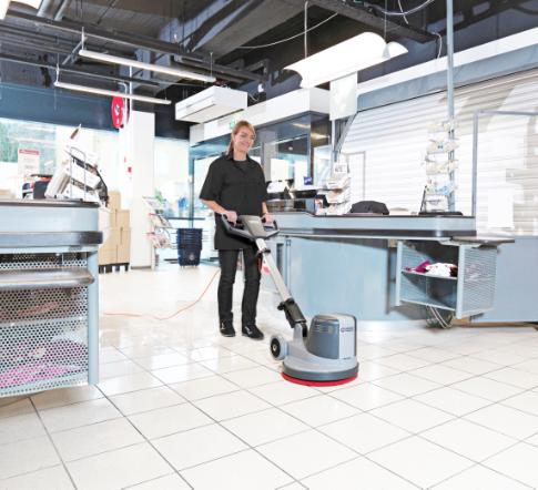 FM400 L kan bruges med en børste/rondel med 43 cm i diameter, og er beregnet til middelkrævende brug. Komfortable i brug og giver effektive resultater. Vask, sprayrengøring og stripping af hårde gulve udføres hurtigt og effektivt.