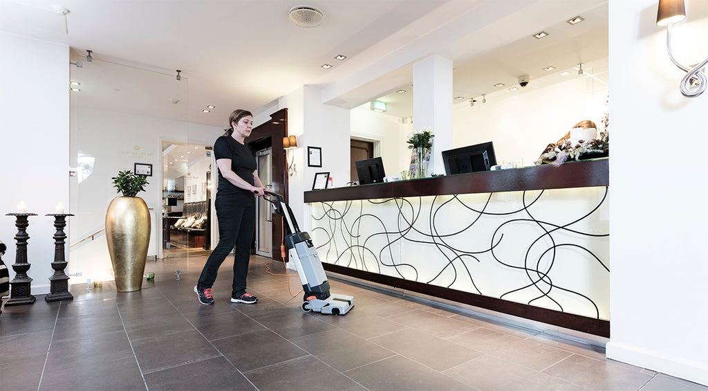 I forhold til den manuelle løsning med moppe og gulvspand klarer denne kompakte, opretstående gulvvasker rengøringsopgaven meget hurtigere og med et bedre resultat.