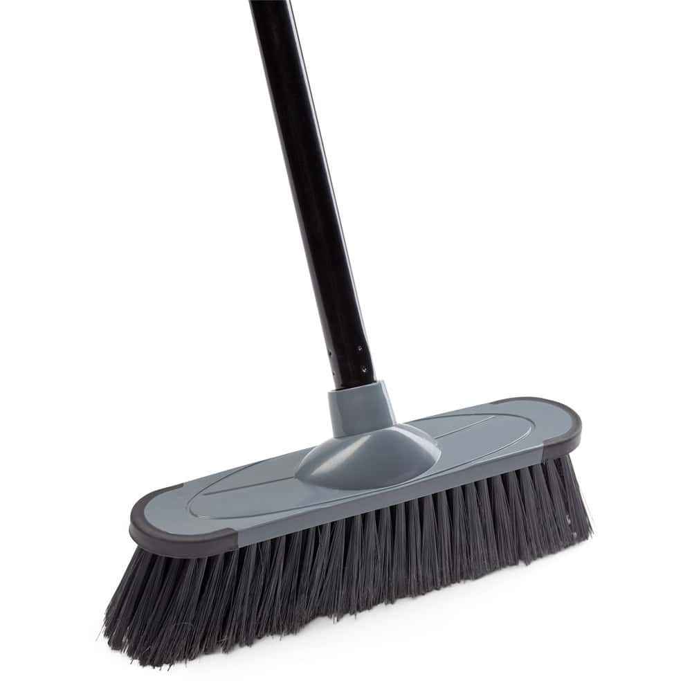 Grå indendørs fejekost til daglig rengøring. Gevindet på kostehovedet er skrå-vinklet, så den ligger godt på gulvet og i hånden under fejning. Gummi for enderne af kostehovedet, for blidere modstand mod vægge, bord- og stoleben mv. Ophæng for enden af skaftet, således den kan hænge i f.eks. kosteskabet eller på væggen i bryggerset. Skaftet er 118 cm og kostehovedet er ca. 28 x 5 cm.