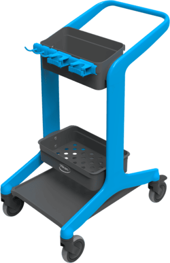Vikans HyGo er den første mobile rengøringsstation til føde- og drikkevareindustrien, som kombinerer hygiejne, effektivitet og manøvredygtighed i en specialbygget løsning. Ud over mere effektiv rengøring løser HyGo også problemer med begrænset plads, mistet udstyr og tidsspilde. HyGo har et smalt stel og 360 graders hjul, så den er nem at navigere gennem døråbninger og på andre smalle steder. Modulerne og ophængene til rekvisitter kan tilpasses, når dine behov ændrer sig. Ophængene har som standard plads til op til fem rekvisitter. Det er muligt at tilkøbe yderligere ophæng, så HyGo kan rumme op til 12 monterede rekvisitter. De to bageste hjul kan låses. Den øverste bakke kan bære op til 12 kg, og den nederste bakke kan bære op til 20 kg. HyGo kan skilles ad, og de enkelte dele kan tørrengøres eller vådrengøres.