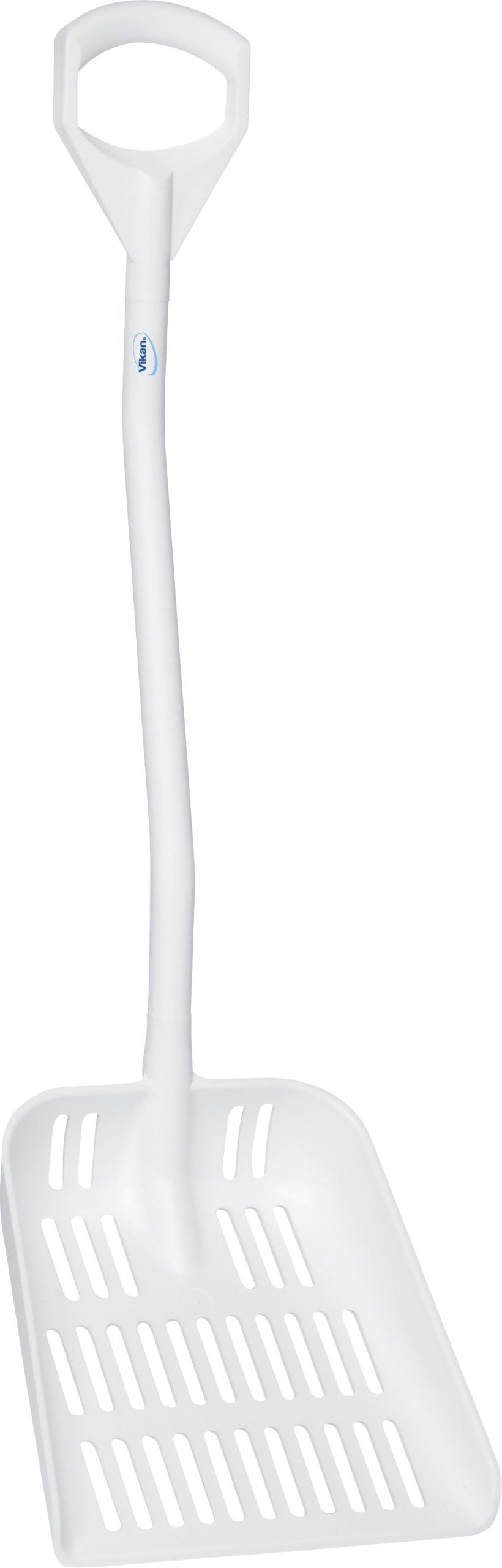 Ergonomisk stabil hvid drænskovl med kort skaft og stort blad med huller. Velegnet til områder i fødevareindustrien, hvor afdræning ønskes.