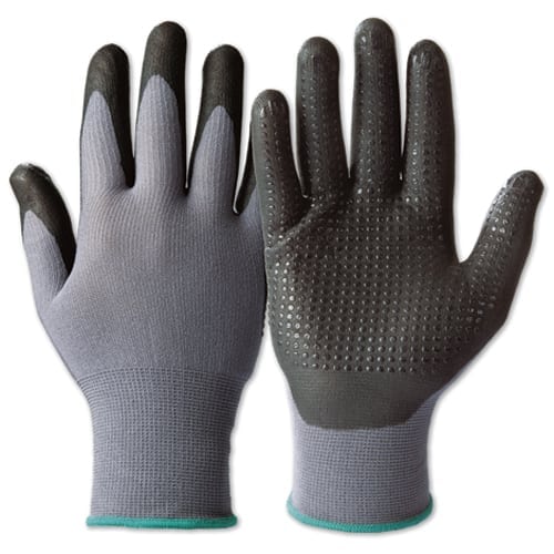 Sømløs polyamid handske. PU-dyppet med nitrildotter, som sikrer et godt greb selv på olierede og fedtede emner. Ideel til værksteder og mekanikere. Længde: 215 – 270 mm.