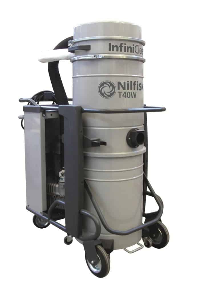 T40W er en mobil industristøvsuger til opsugning af våde og tørre materialer. Den leveres med 50- eller 100-liters beholder samt med Longopac eller plastpose GU (Gravity Unload).