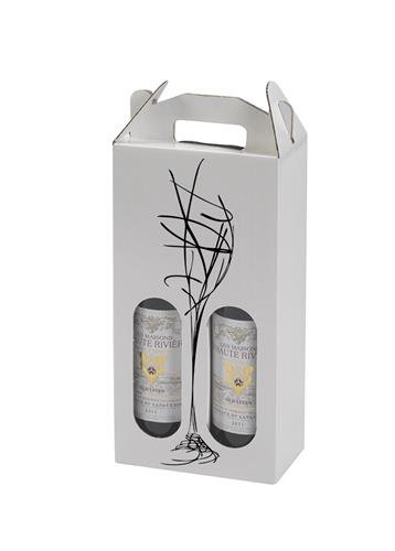 Denne eksklusive vinkarton med tryk er belagt med klar lak og passer til to vinflasker. Kartonen har et håndtag samt to ruder. Pappet fra ruderne fungerer som en let adskillelse i æsken, således at flaskerne ikke klirrer. Vinkartonen egner sig til mange forskellige lejligheder, men passer især godt til firmagaver eller gaven til værten.